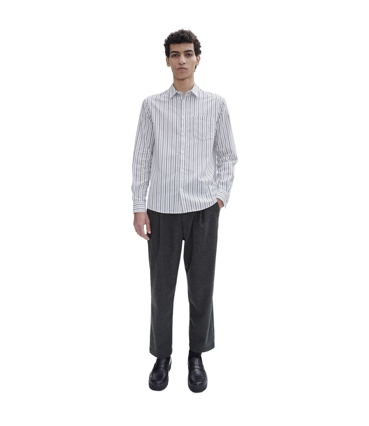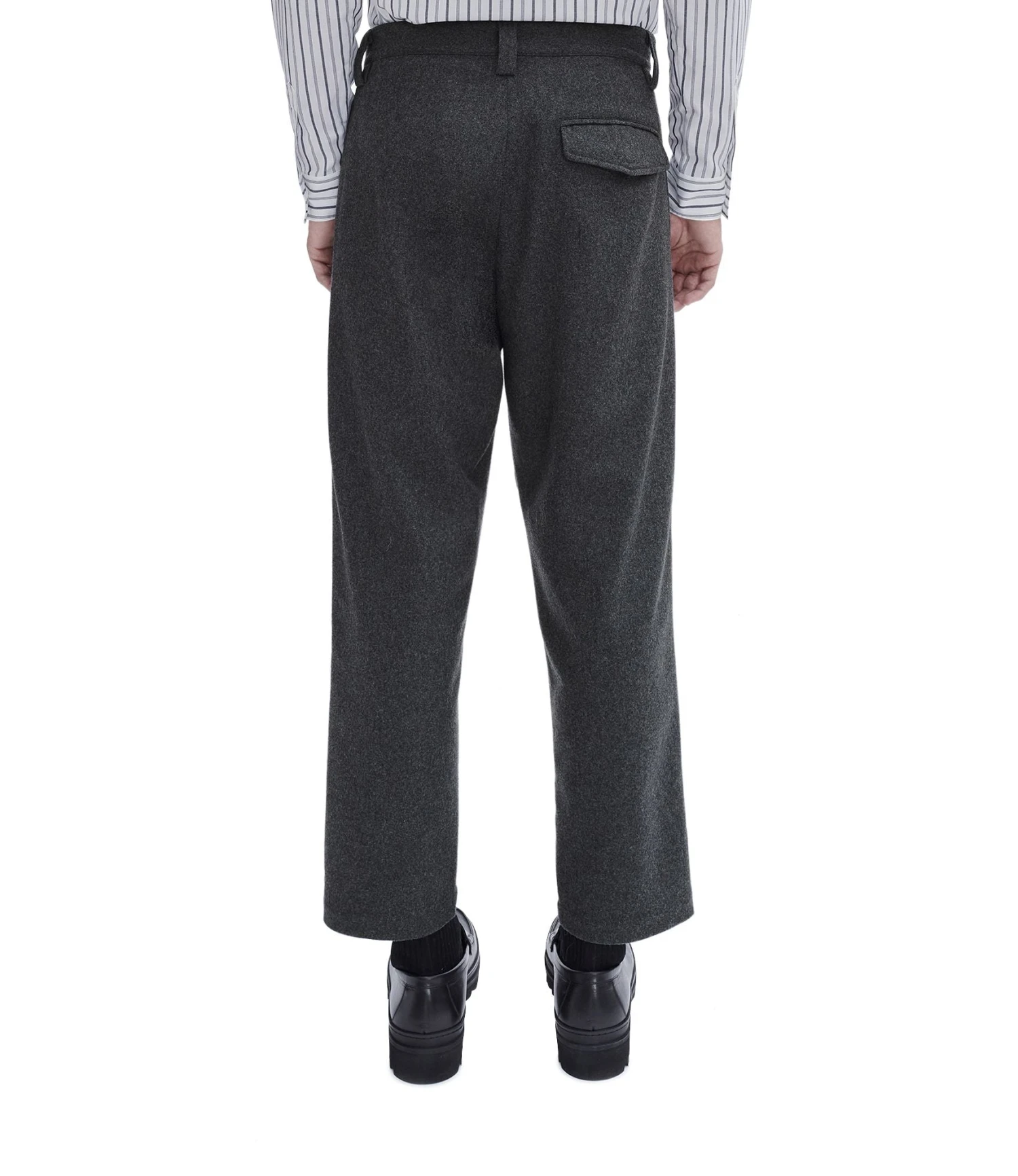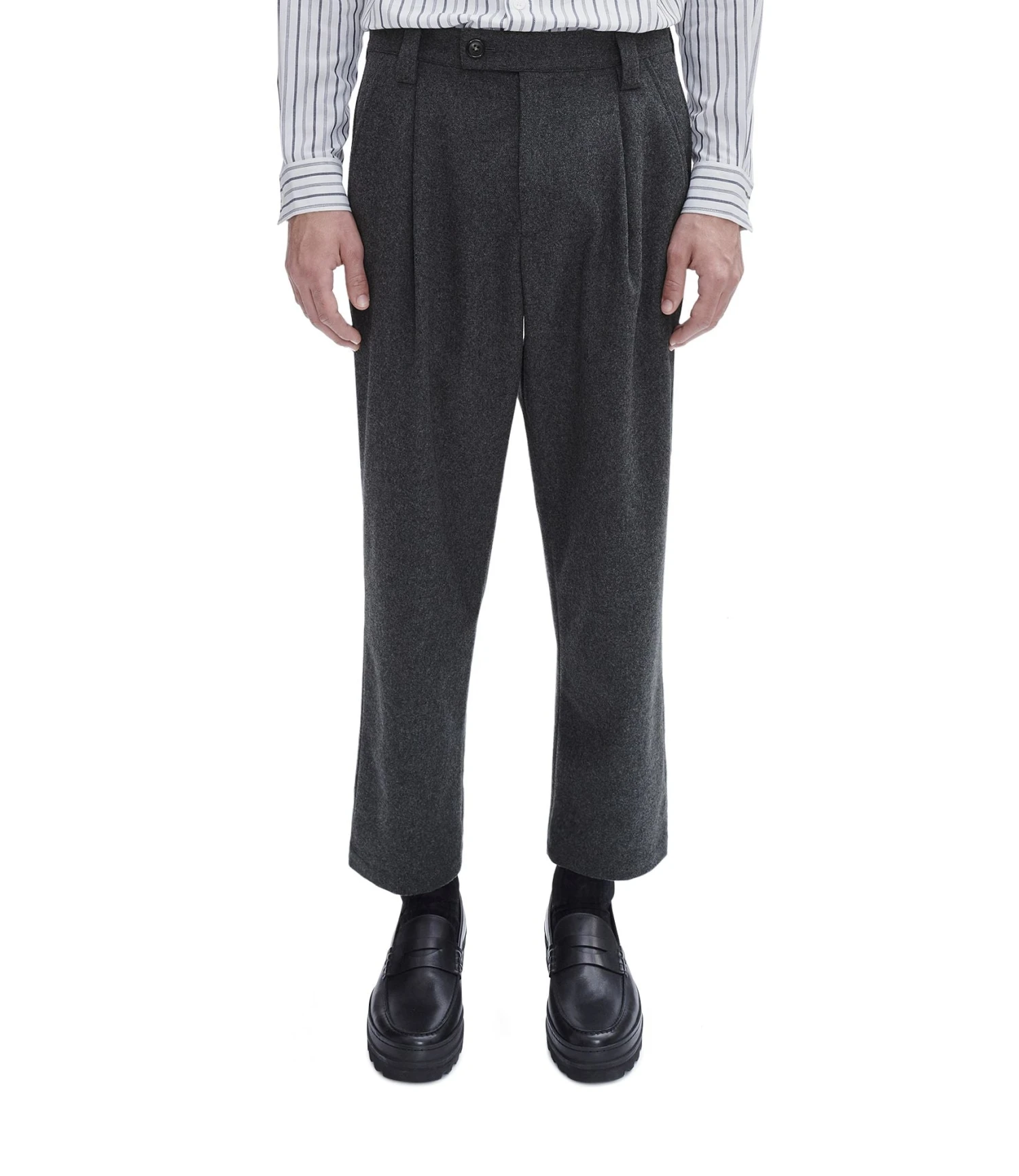 Established in 1987 by fashion designer Jean Touitou, A.P.C. derives from Atelier de Production et de Creation, and is known for its relaxed and minimal approach to design. Made from a recycled wool blend fabric, theΒ Renato Trousers are a chino-style trouser that have a cropped, wide leg with a loose fit.