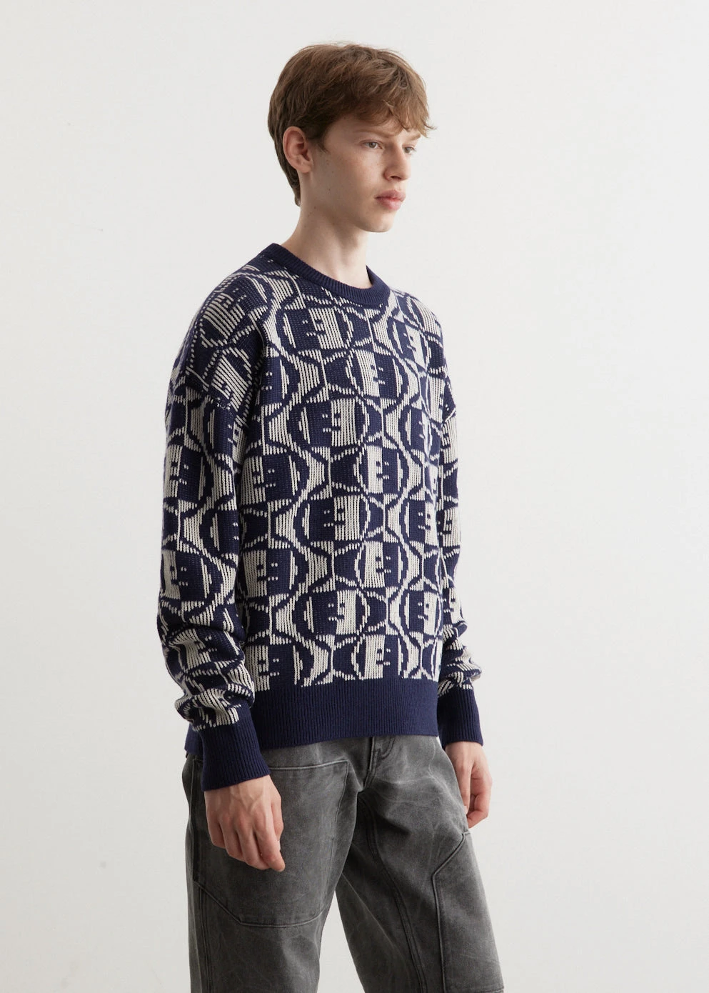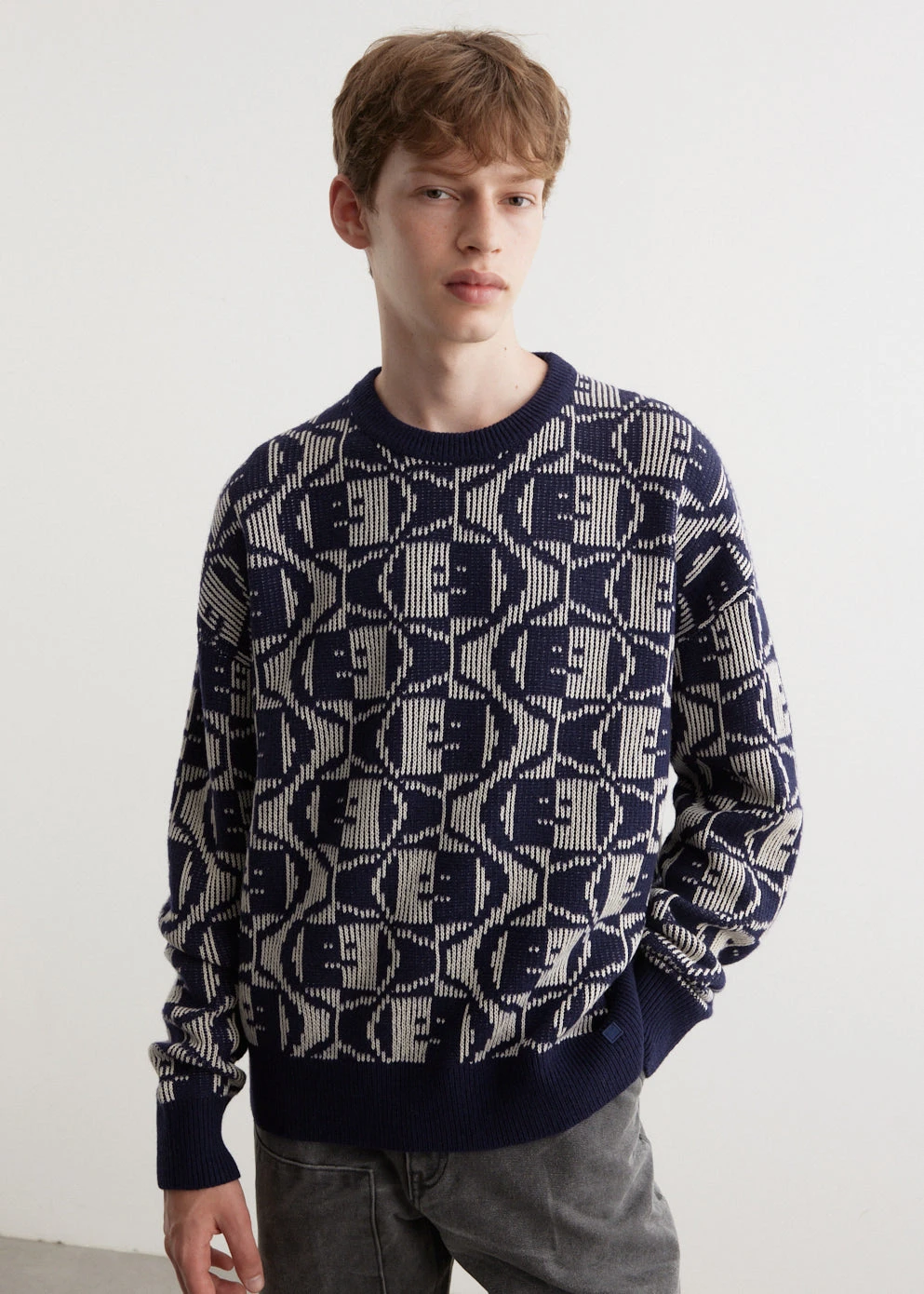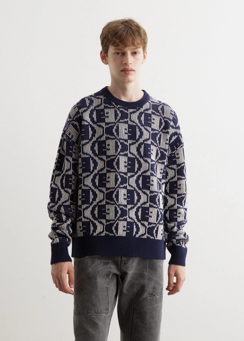 Defined by its experimental take on Scandinavian minimalism, Acne Studios blends technical design with an unexpected palette and androgynous style cues. The sub-label “The Face” focuses on a minimal approach and a monochrome colour palette with the recognisable “not too happy, not too sad” logo. Made from a lambswool-cotton blend, the Katch 2 Tones Face is a classic crewneck-knit that’s adorned with an all-over two-tone Face logo pattern.