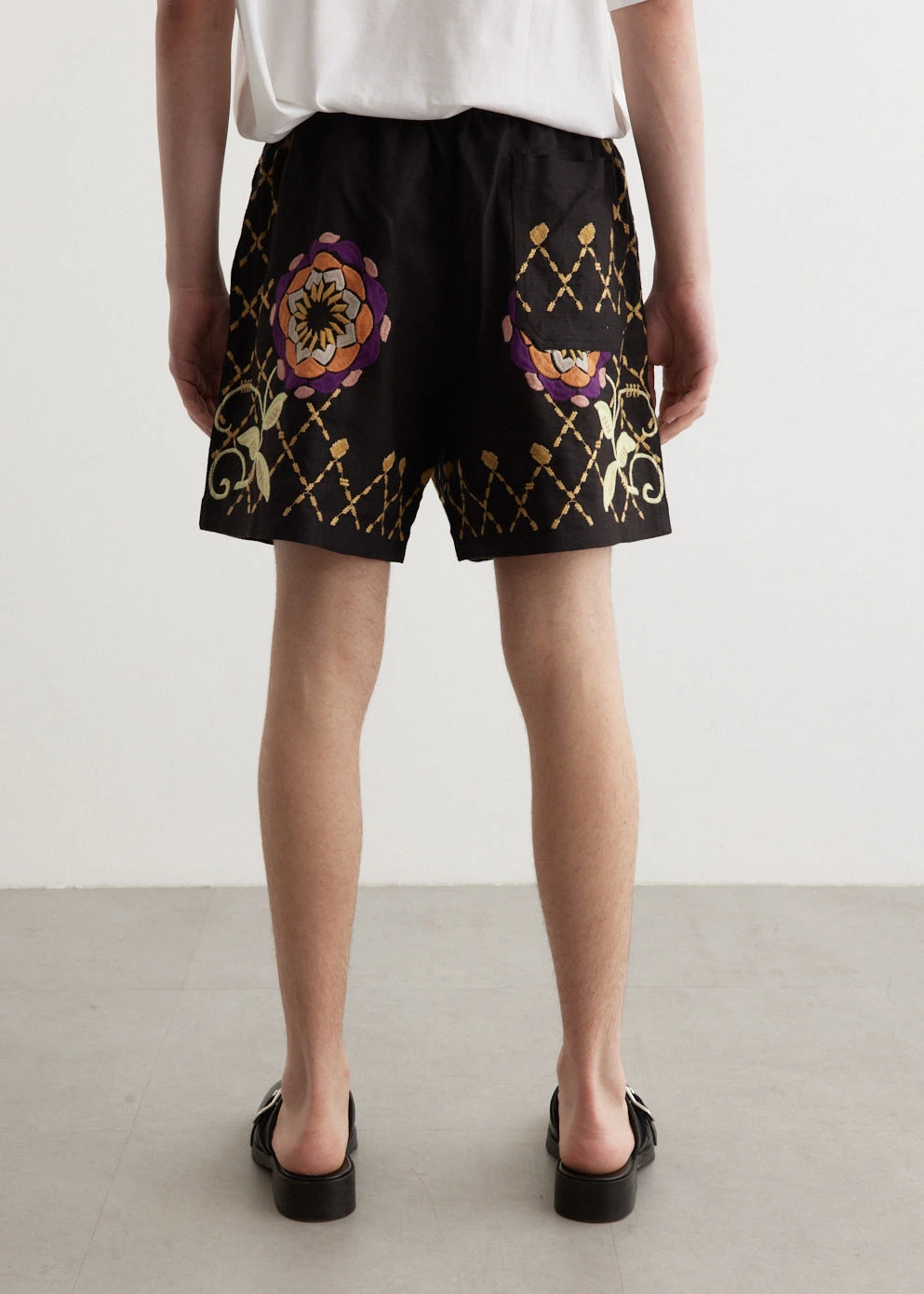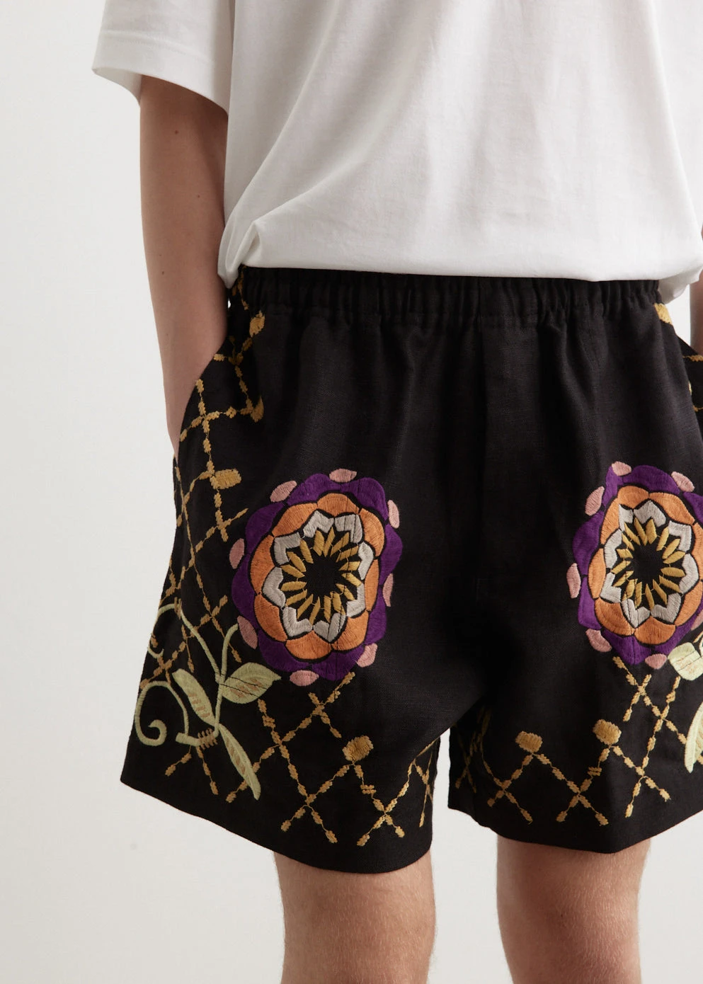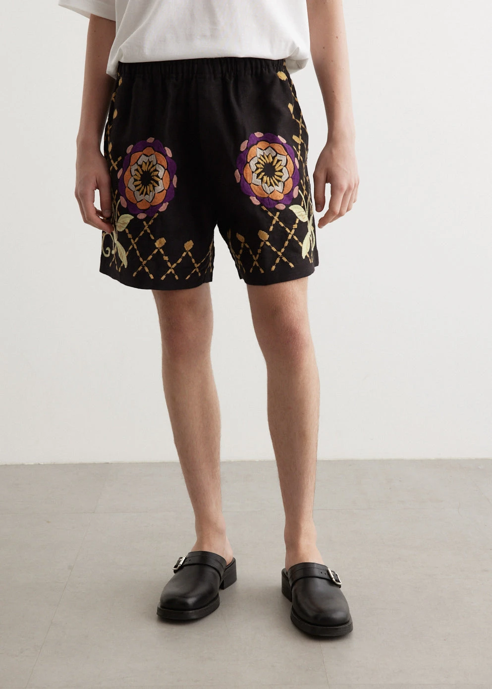 When Emily Adams Bode founded her eponymous label, Bode (pronounced Boh-dee), she did so with the intention of expressing a sentimentality for the past through her creations. The Floral Pinwheel Shorts are inspired by a tablecloth from the 1960s. Adorned with reproduced embroidery, it features a colourful satin-stitched pattern of roses on a trellis.