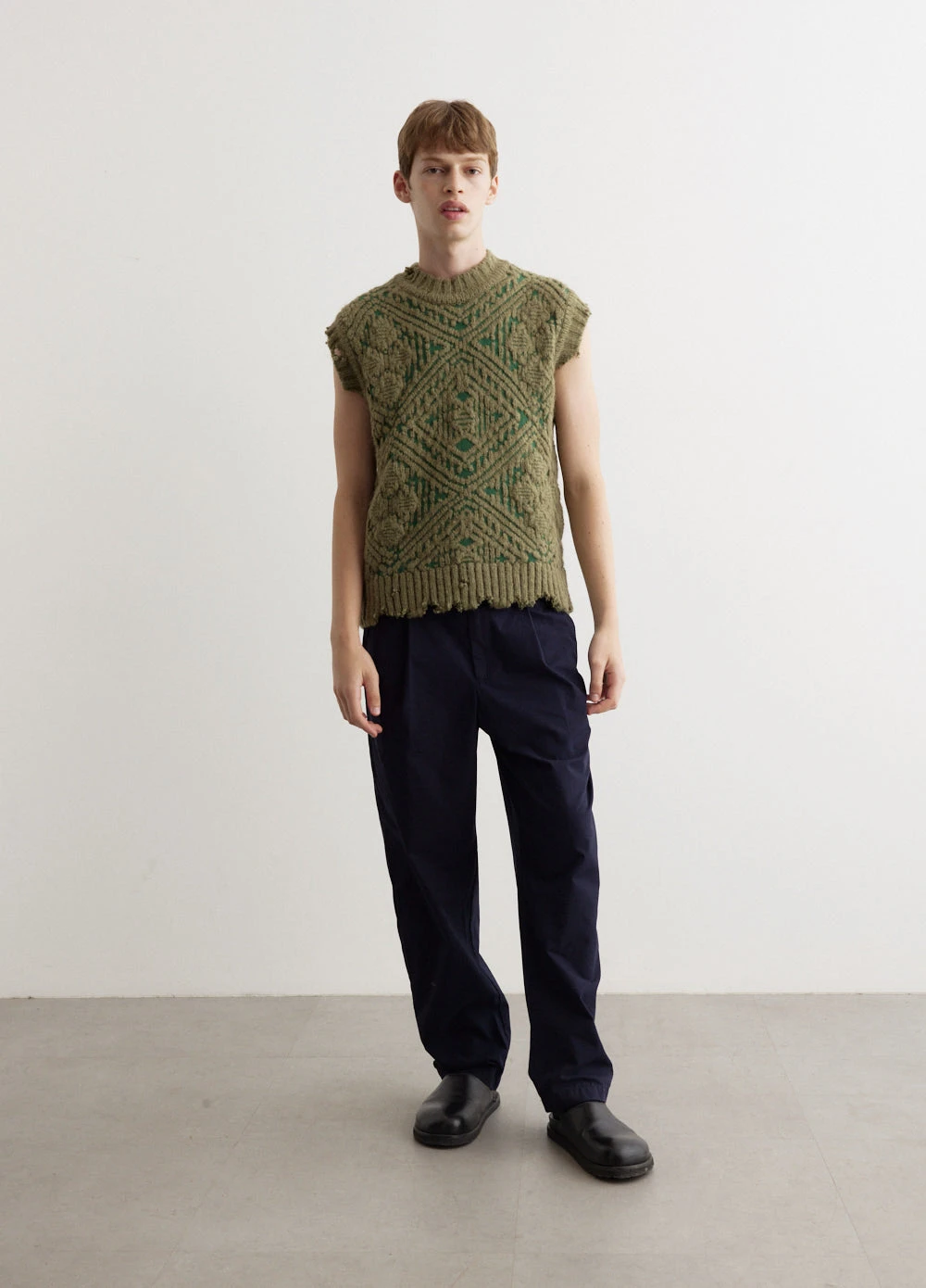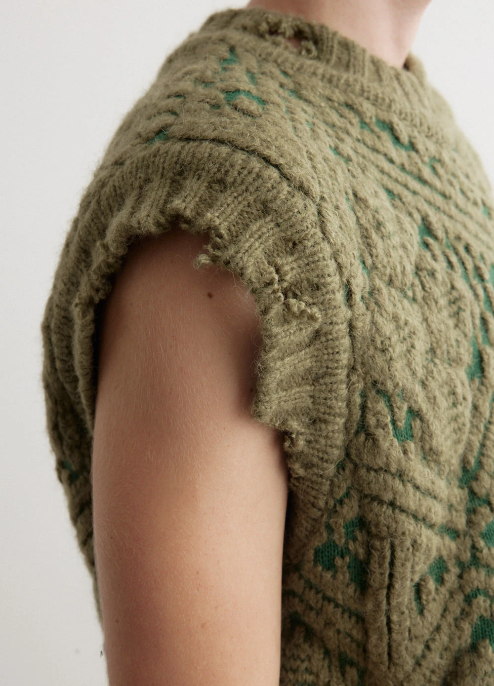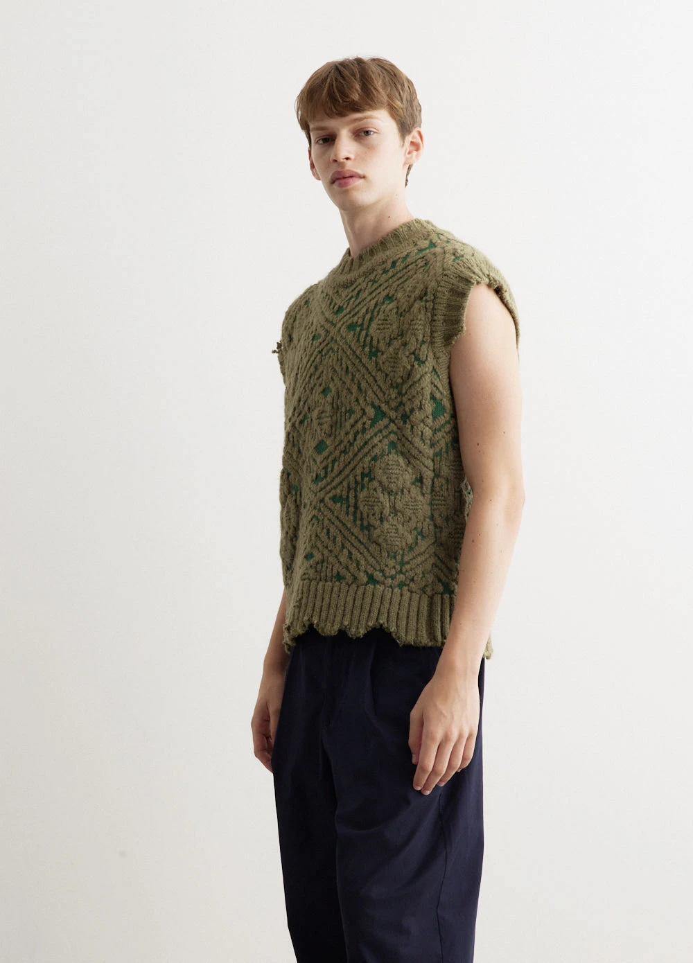 The identity of Andersson Bell was inspired by the merge of two contrasting cultures, reinterpreting Scandinavian aesthetic to create garments from a Korean perspective. Knitted from an acrylic blend, the Jacquard Crew-Neck Vest is designed with a jacquard graphic pattern with distressing throughout.Β