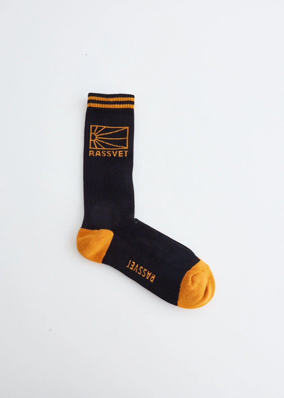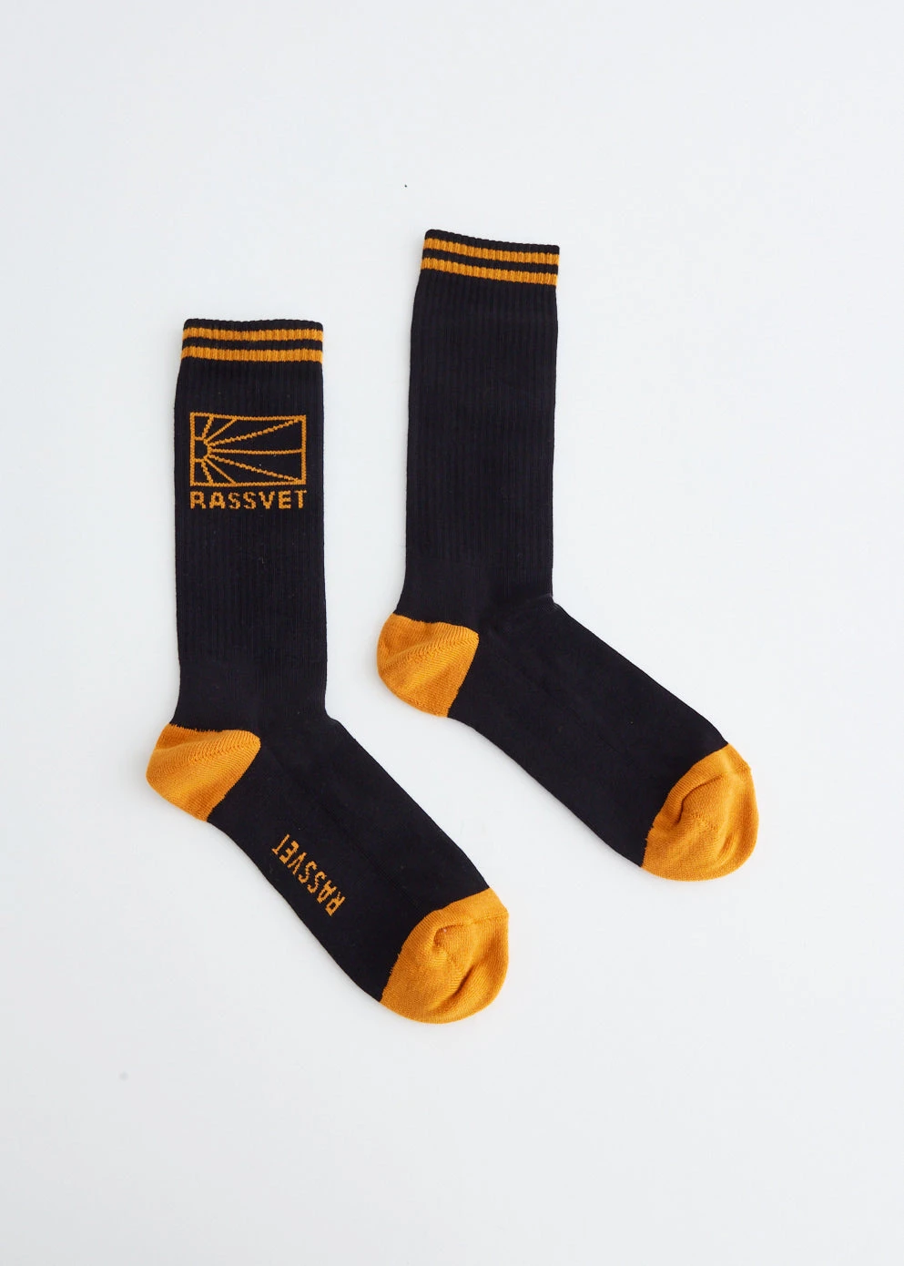 Russian brand PACCBET, founded by Gosha Rubchinskiy in 2016, is designed in collaboration with his long-time friend and pro-skater Tolia Titaev. The brand is pronounced βrassvyetβ thanks to the nuances of the Cryllic alphabet. The Knit Logo Socks have a jacquard logo and ribbed neck.