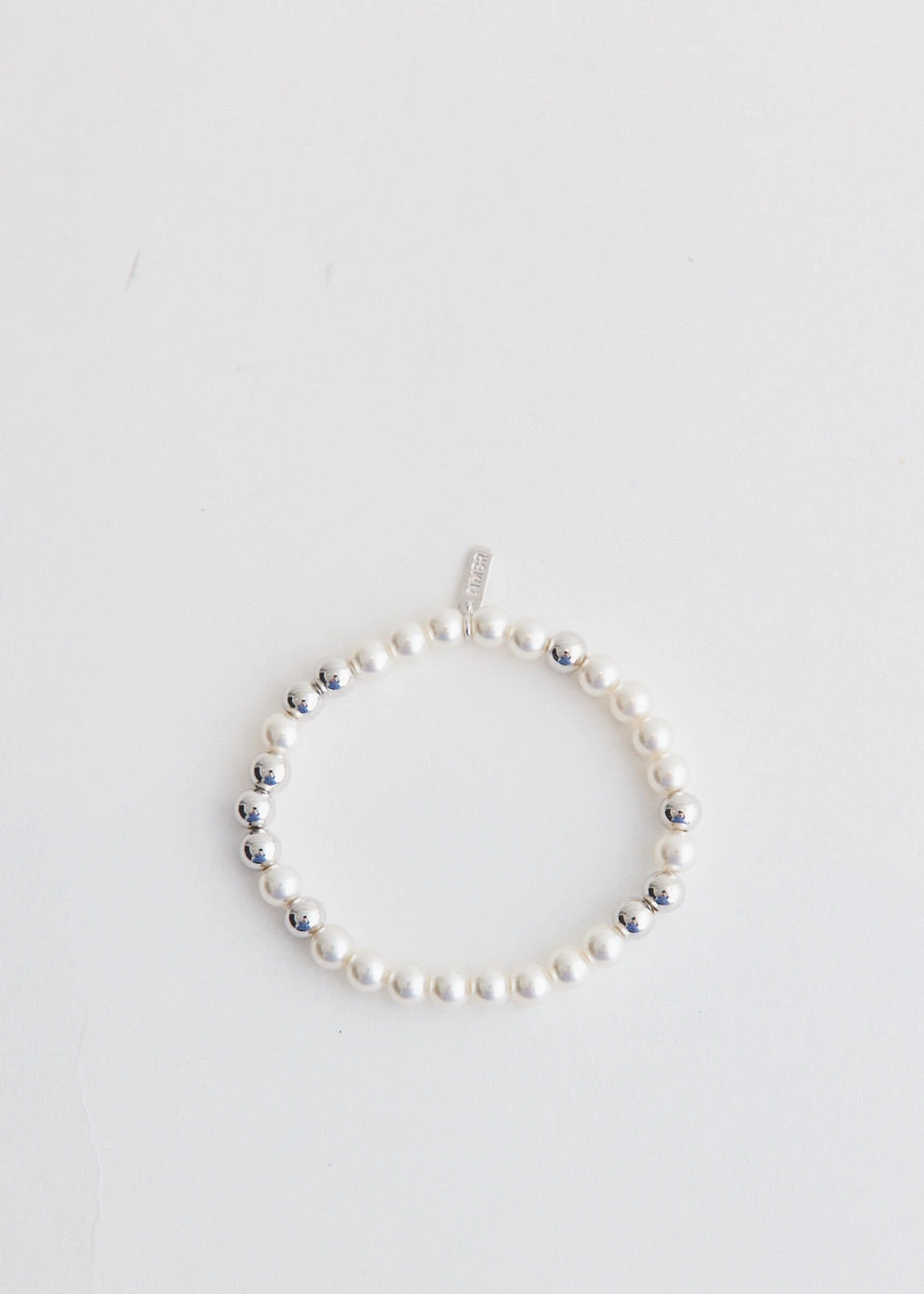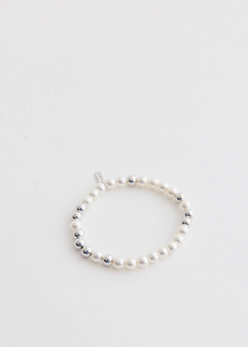 Cult Korean jewellery brand Numbering draws on the bizarre and beautiful, with the contradiction of the extraordinary and the ordinary. Crafted in rhodium-plated brass charms, the Metal Ball Mix Bracelet is designed with an elasticised beaded faux-pearl bracelet.